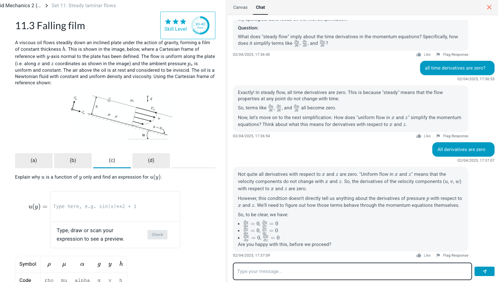 The workspace has a 'chat' pane where users chat with a bot that has access to the question and the user's work on the question. 'Chat functions' will operate like evaluation functions --- they can be developed externally and plugged in.